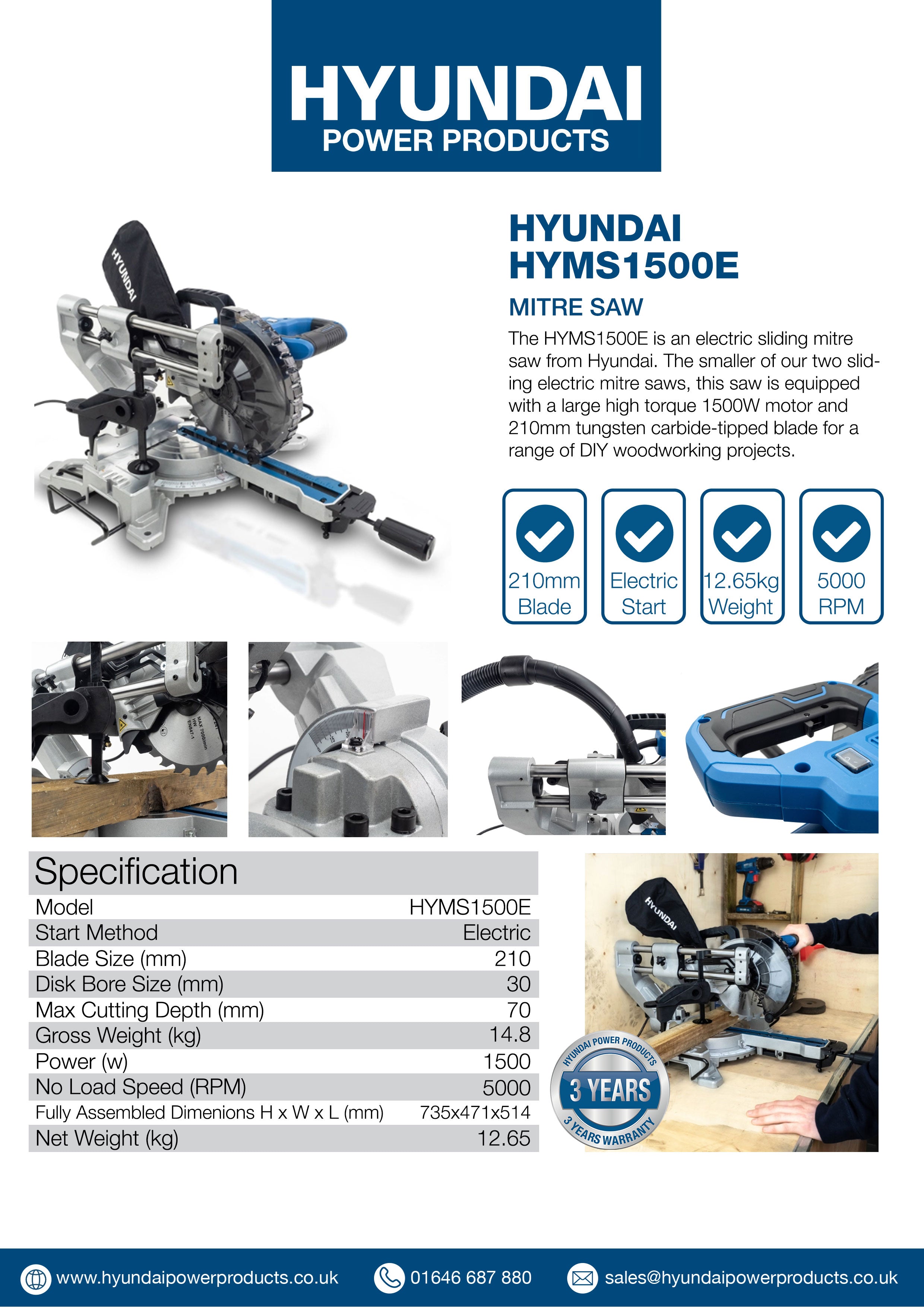 The Hyundai HYMS1500E is an electric sliding mitre saw equipped with a large high torque 1500W motor and 210mm tungsten carbide-tipped blade. This Mitre Saw is ideal for DIY and woodworking projects including furniture making such as benches, display shelves and picnic tables, cutting wood / laminate flooring or decking to size, and cutting trim, skirting boards and beading.