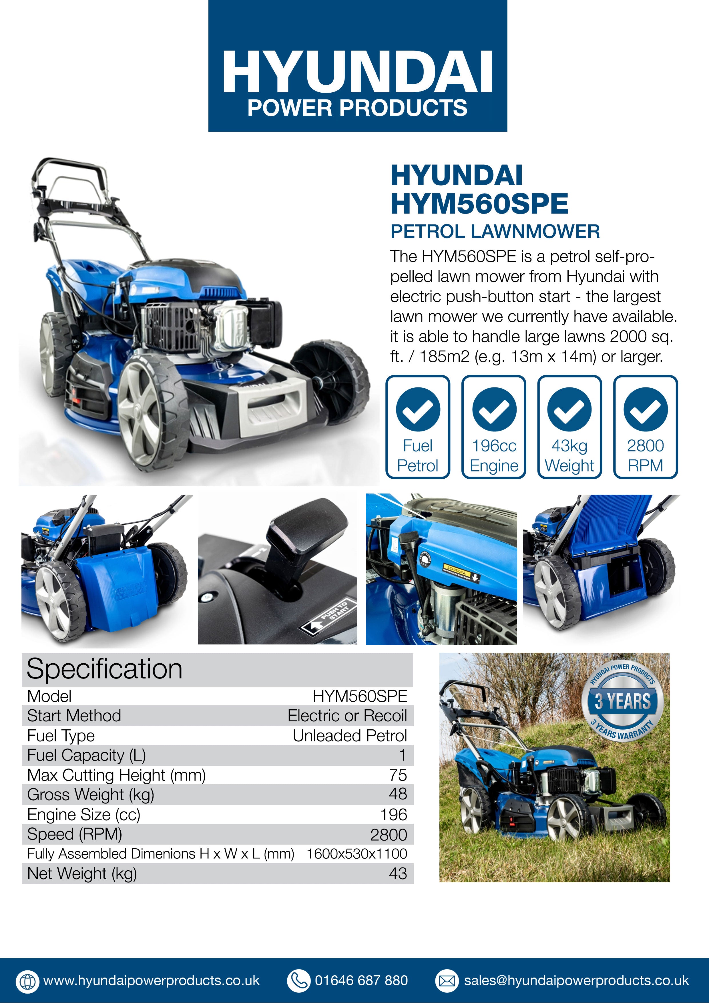 The HYM560SPE is a petrol self-propelled lawn mower from Hyundai with electric push-button start - the largest lawn mower we currently have available. With a powerful Hyundai Euro 5 196cc engine with low fuel consumption, it is able to handle large lawns 2000 sq. ft. / 185m2 (e.g. 13m x 14m) or larger.