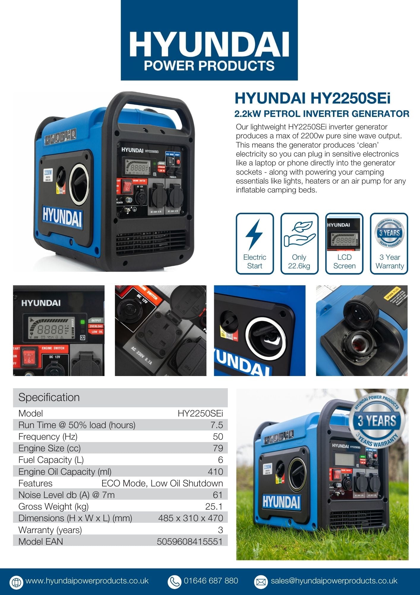 Hyundai 2200W / 2.2kW Petrol Inverter Generator, Electric Start, Pure Sine Wave Output, Lightweight, Quiet Running | HY2250SEi