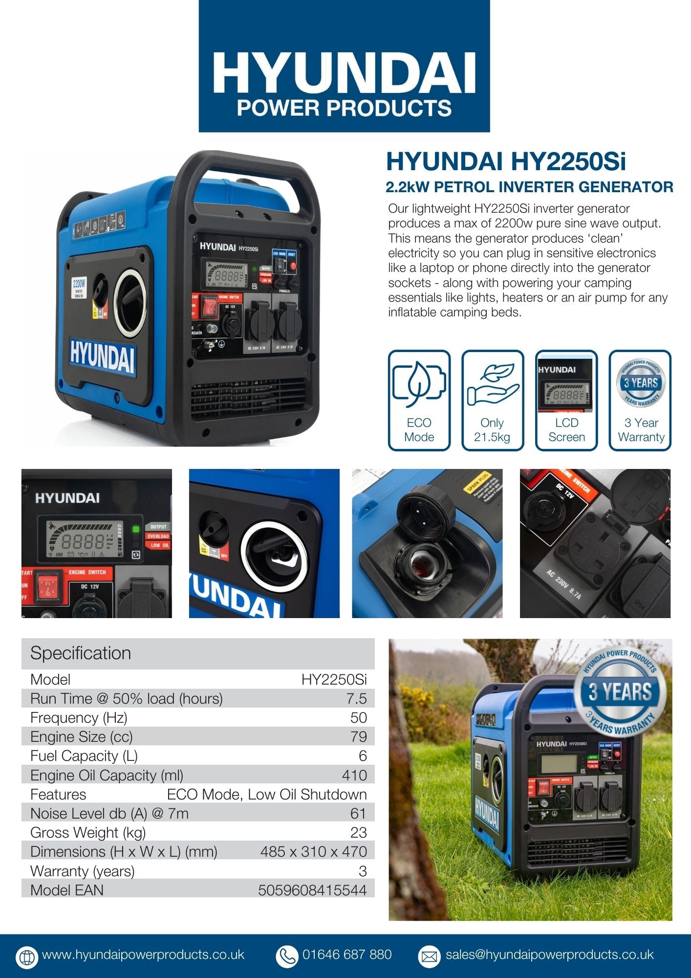 Hyundai 2200W / 2.2kW Petrol Inverter Generator, Pure Sine Wave Output, Lightweight, Quiet Running | HY2250Si