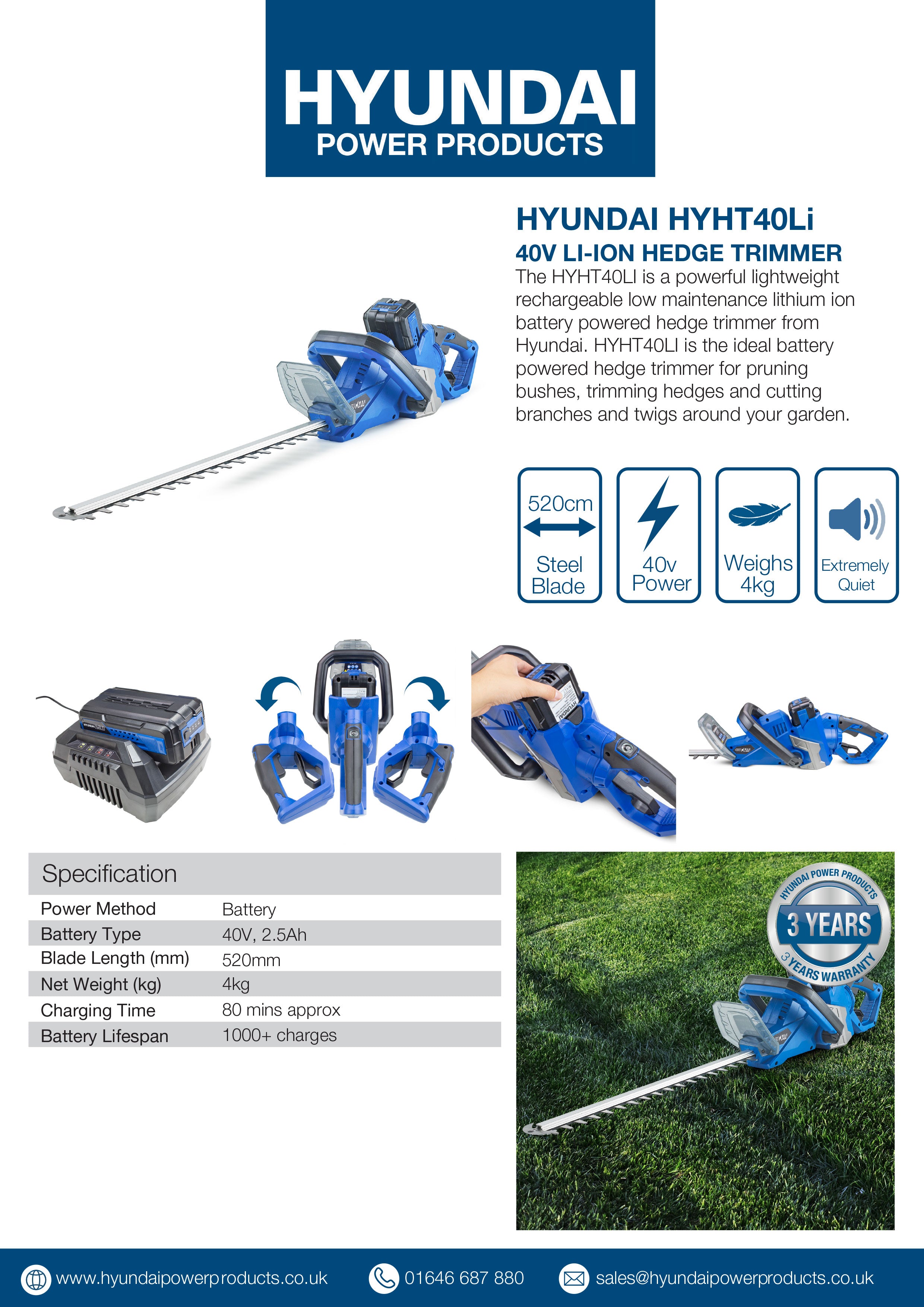 Powered by a 2.5Ah 40v Lithium-ion battery, the HYHT40LI’s brushless motor offers a powerful performance , and will effortlessly handle all types of shrubs and hedgerows in your garden.
