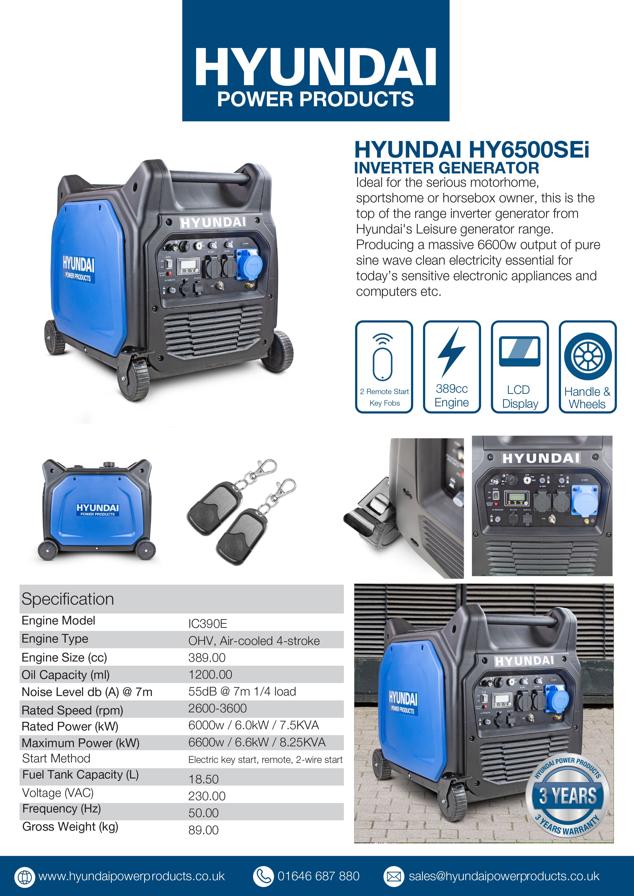 The HY6500SEI is a top-of-the-range portable inverter generator from Hyundai. Providing a convenient and cost-effective source of power, this quiet inverter generator has an impressive maximum output of 6600w / 6.6kW, and continuous power rating of 6000w / 6kW.