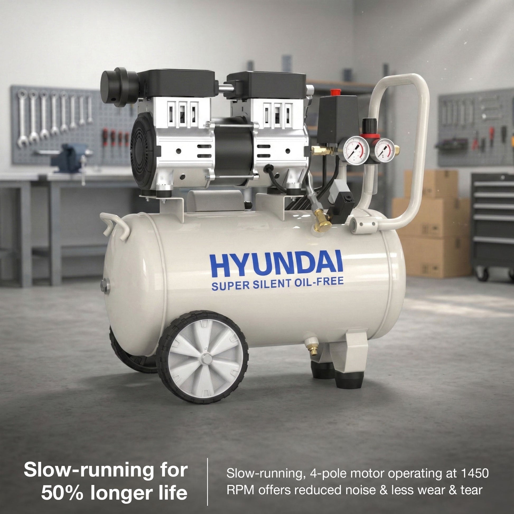 The HY7524X is a powerful yet compact 750w direct-drive oil-free low noise air compressor from Hyundai.